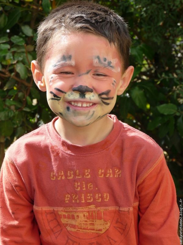 Ce soir en allant chercher ton grand-frère au centre de loisirs, j’ai récupéré un petit tigre. Je plaisante !!! Il y a eu une journée maquillage et Mathéo maquillé en petit tigre. Je trouve que ça lui va très bien. Il est tout mignon.